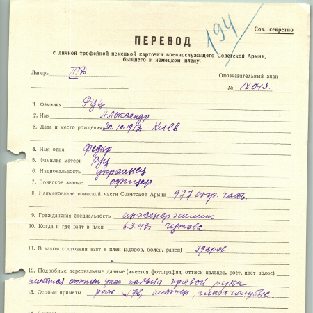Руц Александр Федорович, 20.10.1913 г. р., г. Киев. Офицер, 977 стрелковая часть. Попал в плен 06.03.1943 в Чужове, шталаг III Д.