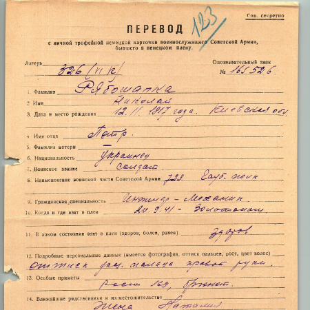 Рябошапка Николай Петрович, 12.11.1917 г.р., Киевская область. Рядовой, 722 гаубичный полк. Попал в плен 20.09.1941 в Золотовске, шталаг 326 (VI K).