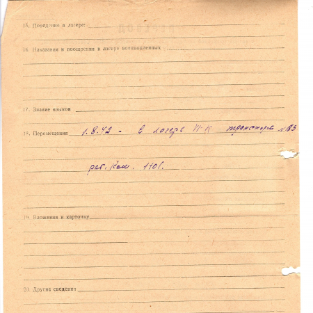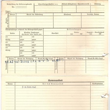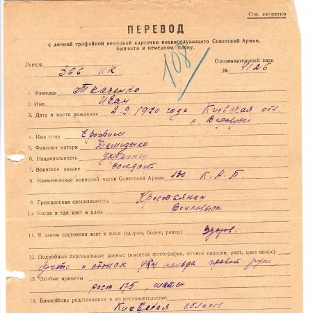 Ткаченко Иван Ерофимович, 02.09.1920 г., с. Вировусько, Киевская область. Рядовой, 130 К.А.П. Попал в плен в Волковыске, шталаг 366. 01.08.1942 переведен в лагерь VI K.