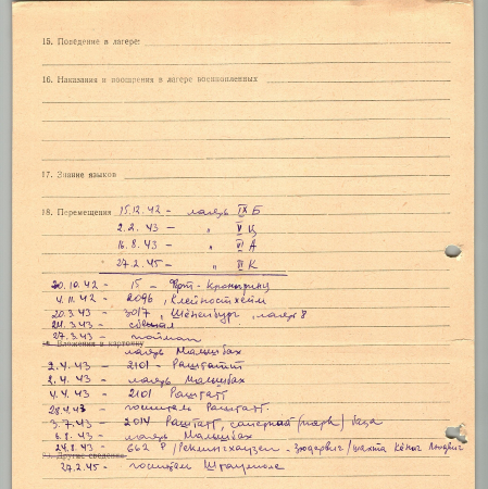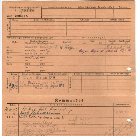 15.12.1942 был переведен в лагерь IX Б, 02.02.1943 - в V Ц, 16.08.1943 - в шталаг VI A, 27.02.1945 перведен в лагерь VI K.