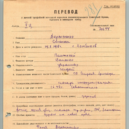 Дерлименко Степан Пантелеймонович, 14.08.1918 г. р., с. Хомбиков. Рядовой, 128 стрелковая бригада. Попал в плен 01.06.1942 в Севастополе, шталаг V Ц.
