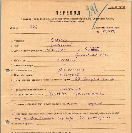 Хмиль Василий Васильевич, 10.06.1921 г. р., с. Ойсеха, Киевская область. Рядовой, 82 стрелковый полк. Попал в плен 09.10.1941 в Запорожье, шталаг 326 (VI K).