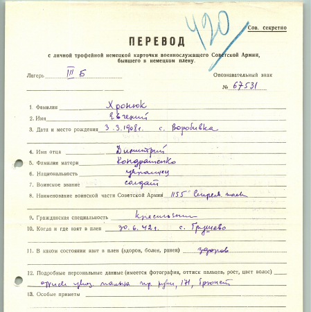 Хронюк Евгений Дмитриевич, 03.03.1908 г. р., с. Воробивка. Рядовой, 1155 стрелковый полк. Попал в плен 30.06.1942 в с. Грушево, шталаг III Б.