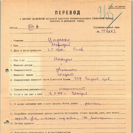 Царенко Мефодий Мануилович, 03.05.1906 г. р., г. Киев. Рядовой, 337 стрелковый полк. Попал в плен 12.11.1944 в Венгрии, шталаг XVII A. 17.02.1945 был переведен в лагерь VI K.