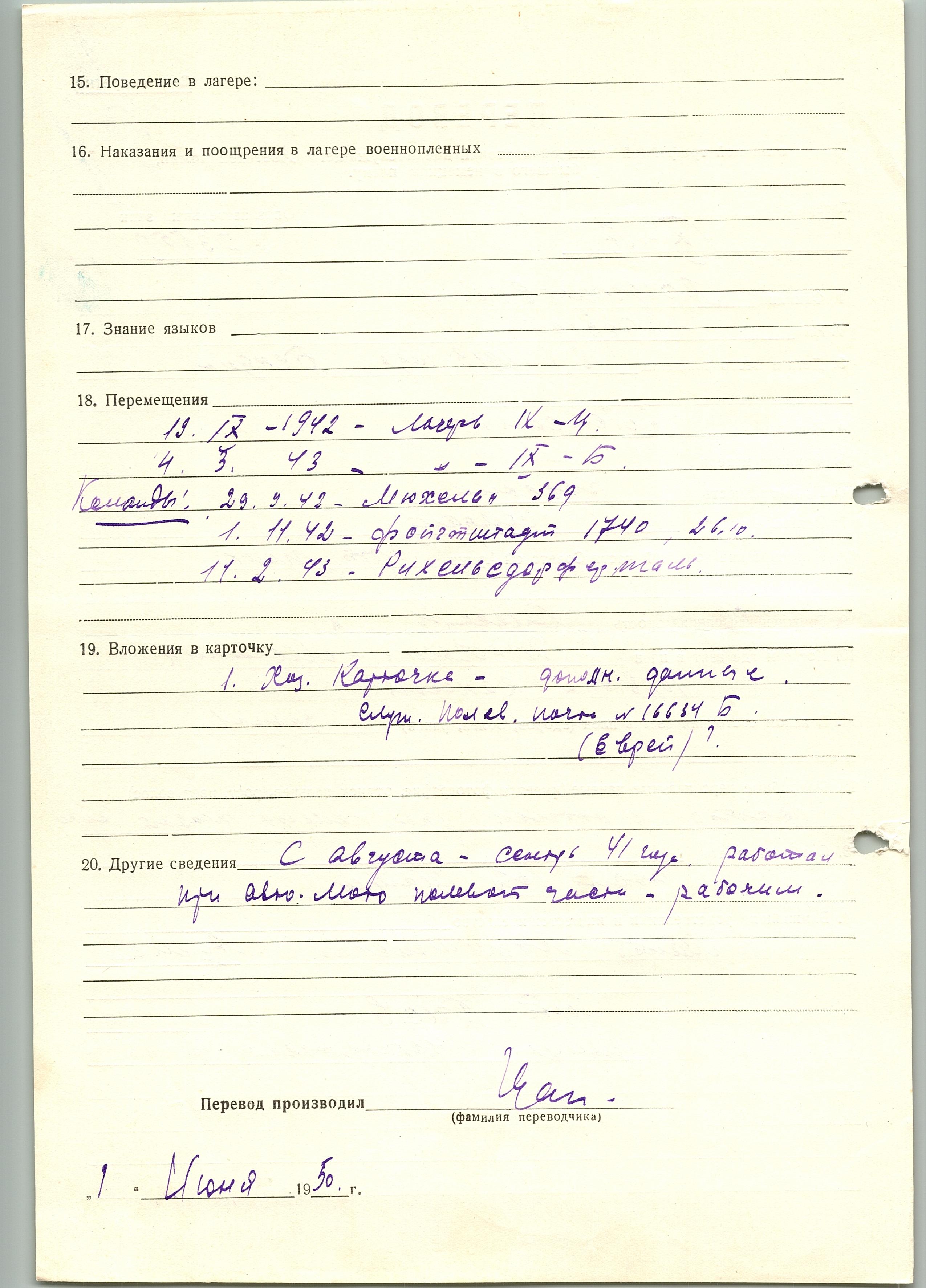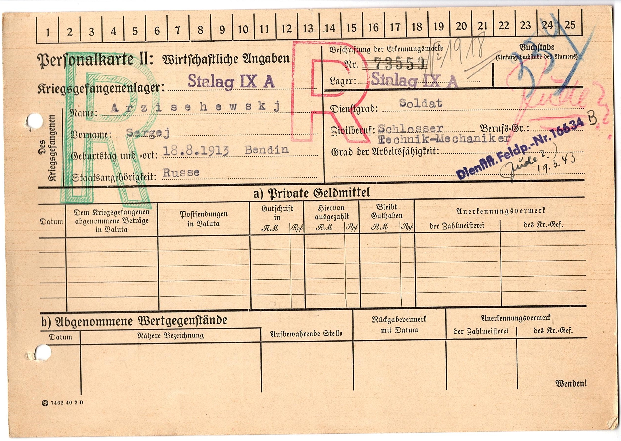 Ацишевский Сергей Александрович, 18.08.1913 г. р., с. Бендин. Рядовой артиллерийского полка. Попал в плен 10.08.1941 г. в с. Каневой, шталаг IX A. 19.09.1942 г. был переведен в лагерь IX Ц, 04.03.1943 г. - в лагерь IX Б.