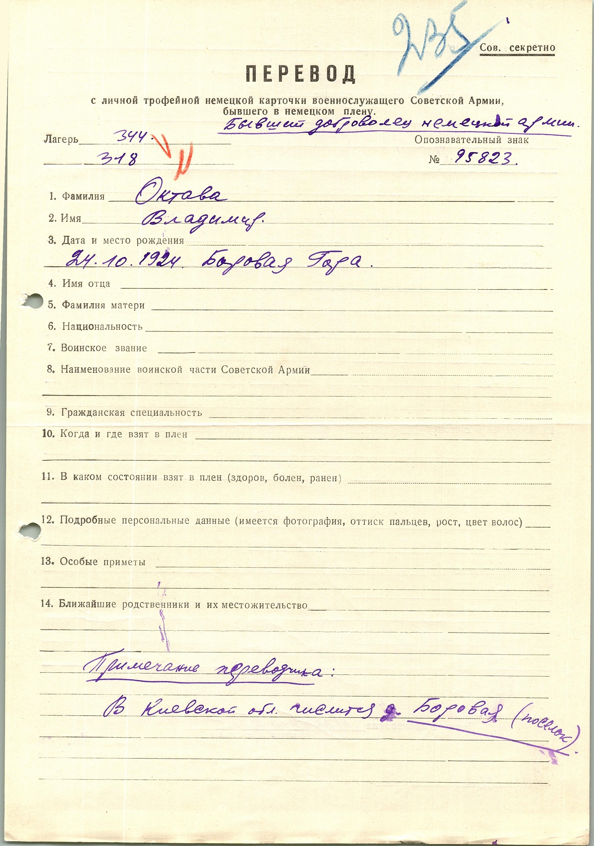 Октава Владимир, 24.10.1924 г. р., д. Баровая Гора. Бывший доброволец немецкой армии. Попал в плен в шталаг 344.