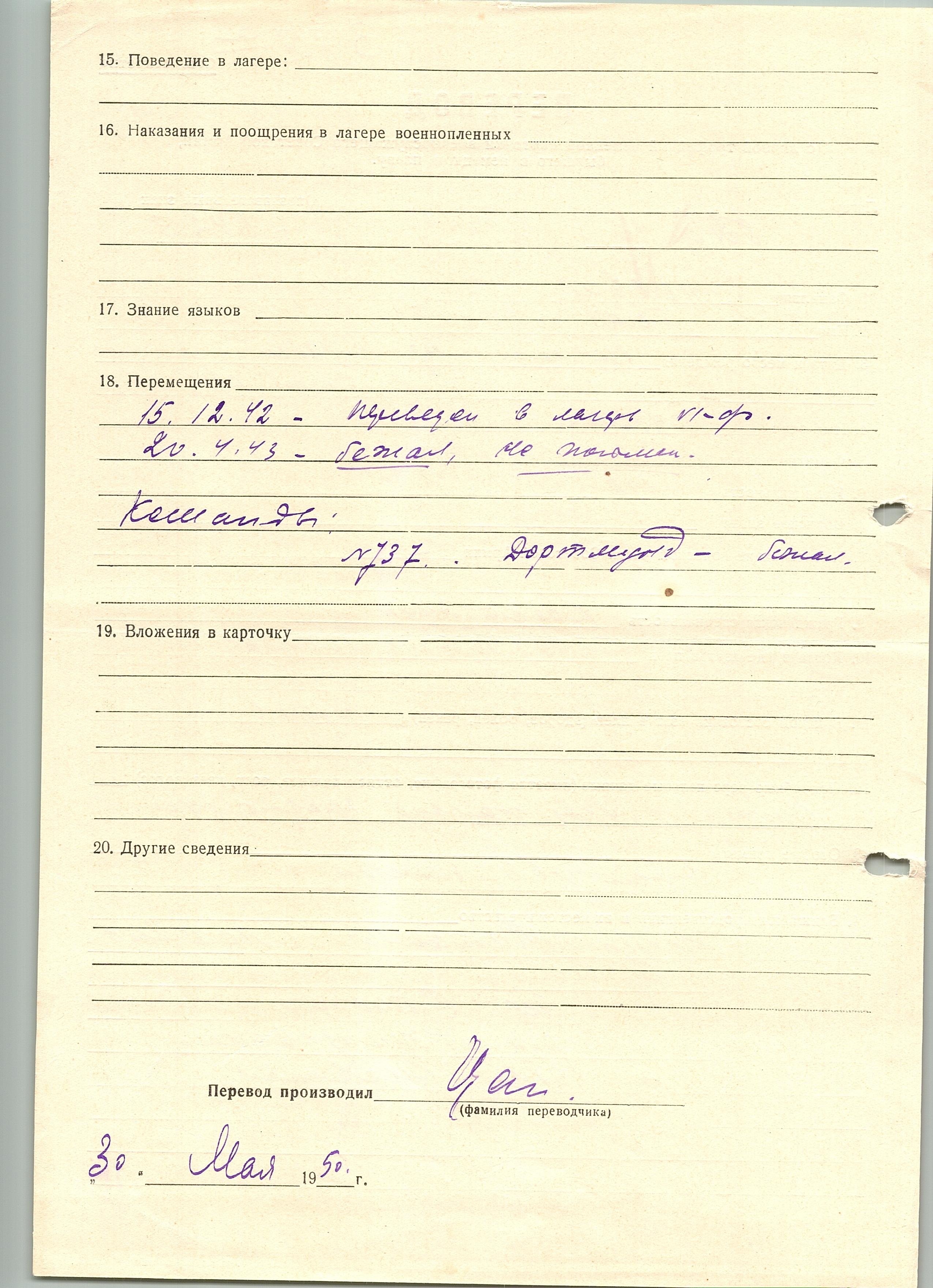 Олехвир Петр Кузьмич, 1904 г. р., д. Ставки, Киевская область. Гражданский. Попал в плен 19.08.1941 г. в Полтаве, шталаг 326. 15.12.1942 г. был переведен в лагерь VI Ф, 20.04.1943 г. бежал из плена.