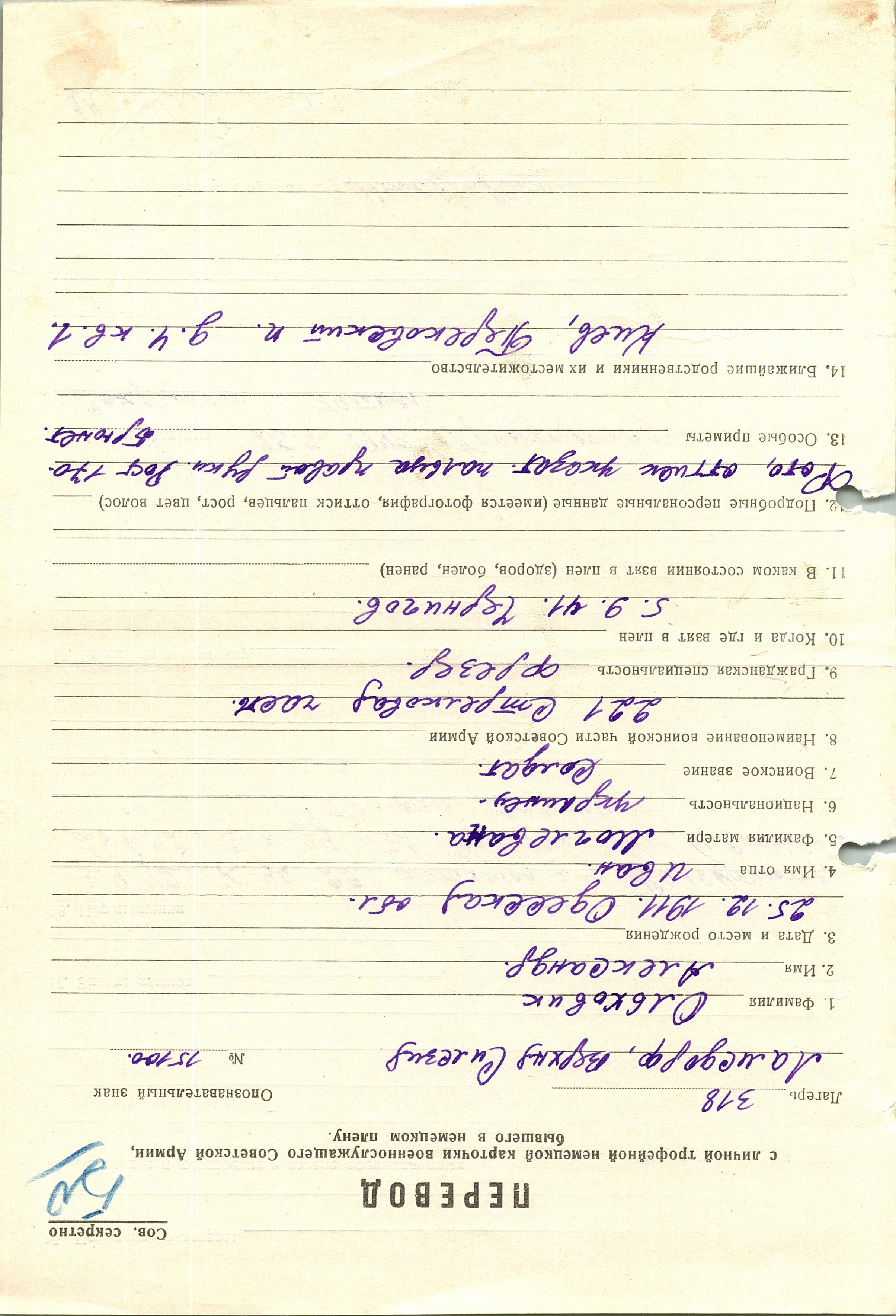 Ольховик Александр Иванович, 25.12.1911 г. р., Одесская область. Рядовой, 221 стрелковая часть. Попал в плен 05.09.1941 г. в Чернигове, шталаг 318 (Ламсдорф). 20.04.1944 г. бежал из плена.