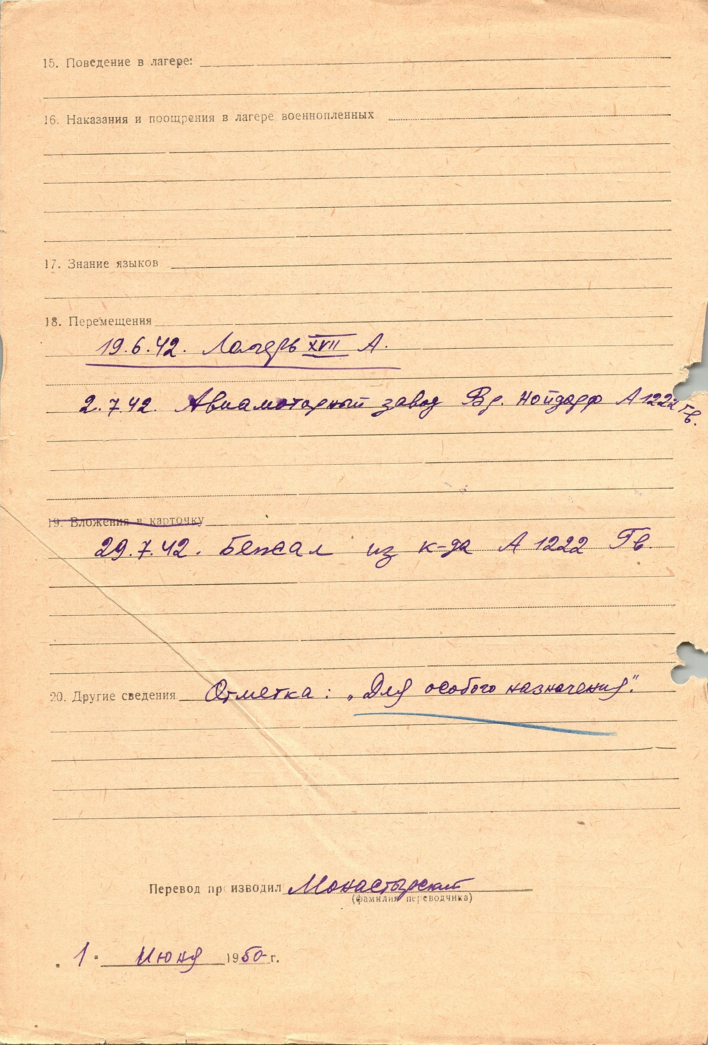 Онегин Евгений Григорьевич, 18.02.1924 г. р., с. Бещучино. Попал в плен 24.04.1942 г. в Павлограде, шталаг 348. 19.06.1942 г. был передан в лагерь XVII A, 29.07.1942 г. бежал из плена.