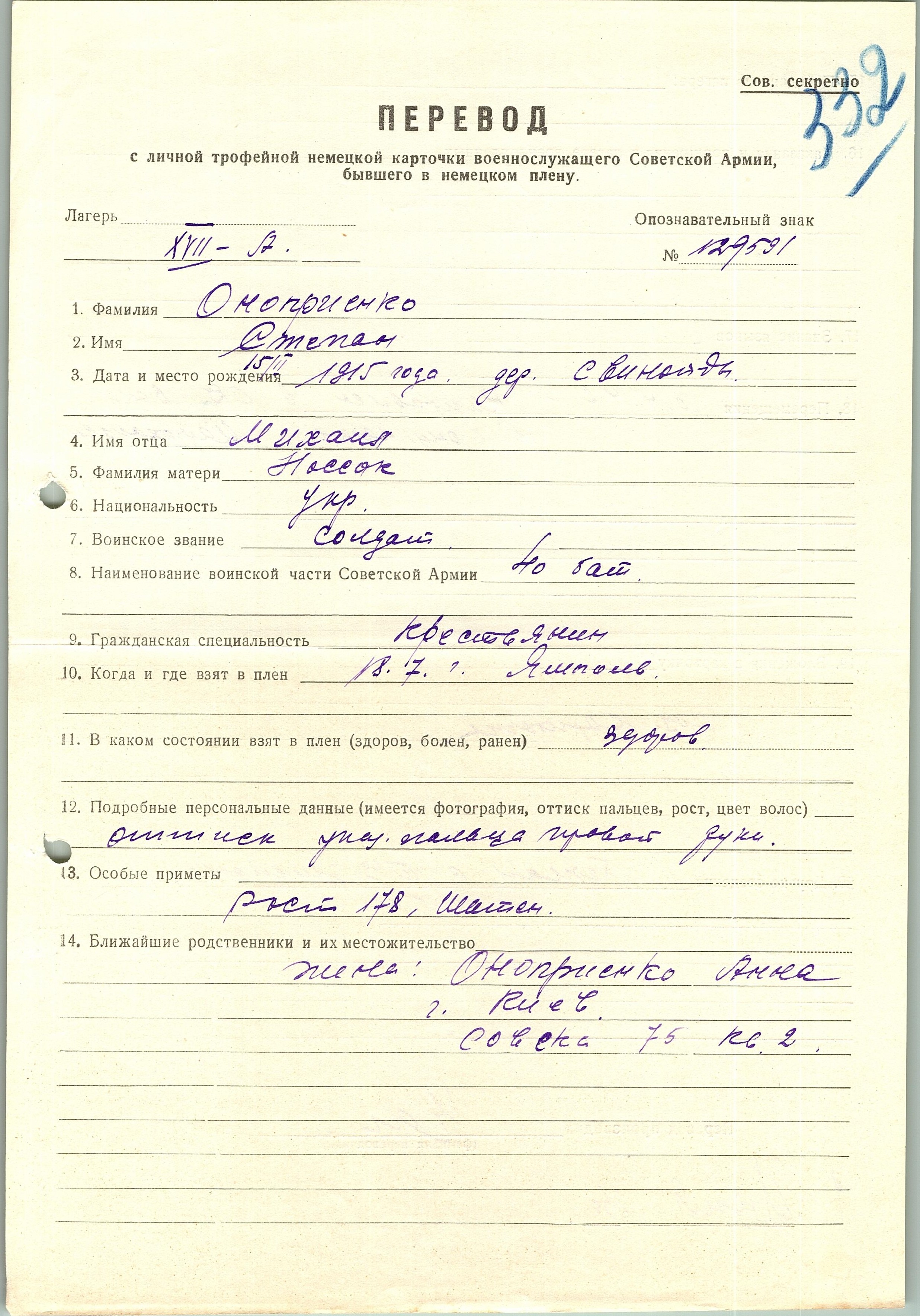 Оноприенко Степан Михайлович, 1915 г. р., д. Свинойды. Рядовой, 40 батальйон. Попал в плен 18 июля г. в Ямполе, шталаг XVII A. 10.04.1943 г. направлен в Сд-Вена в концлагерь Маутхаузен.