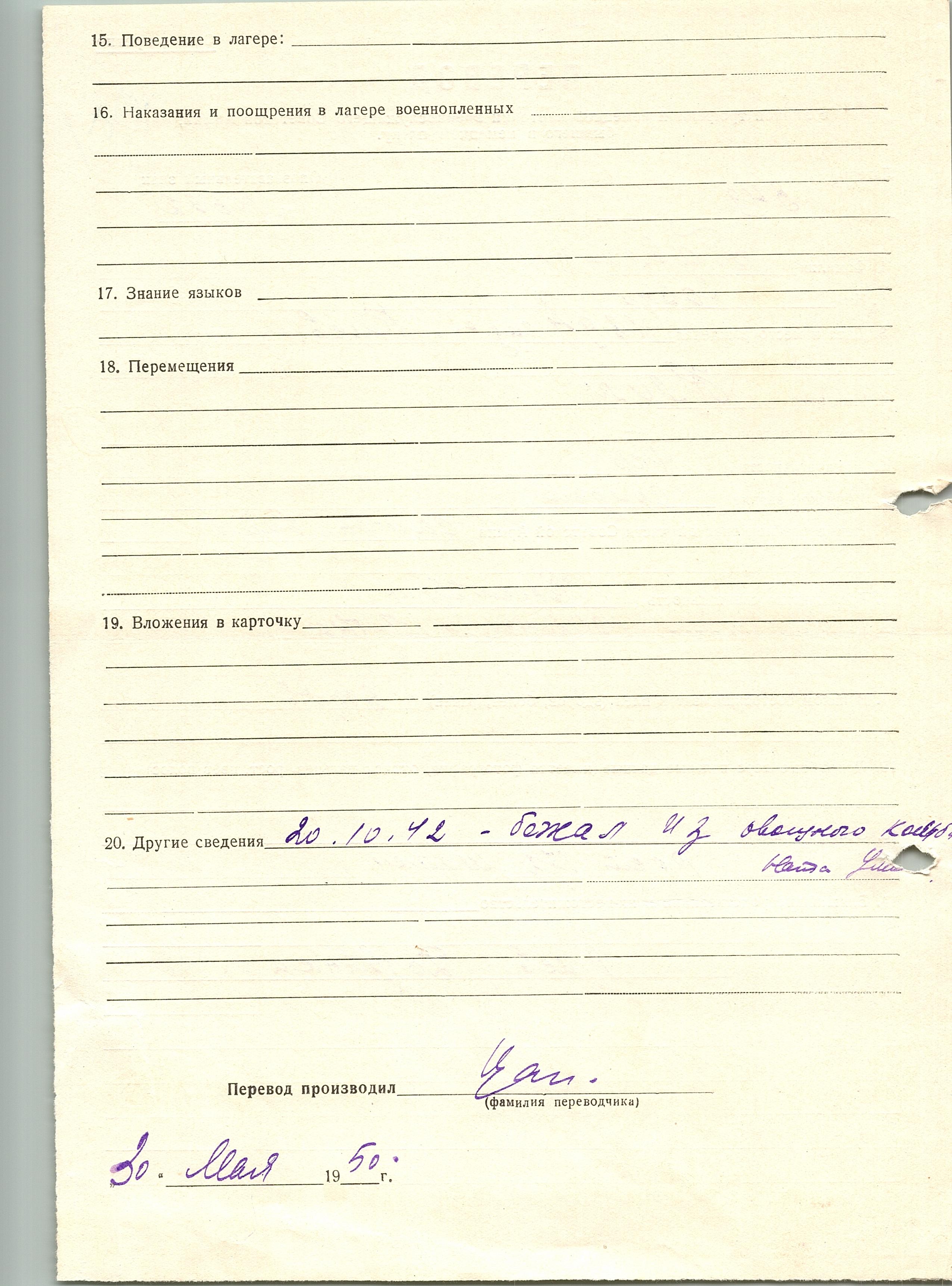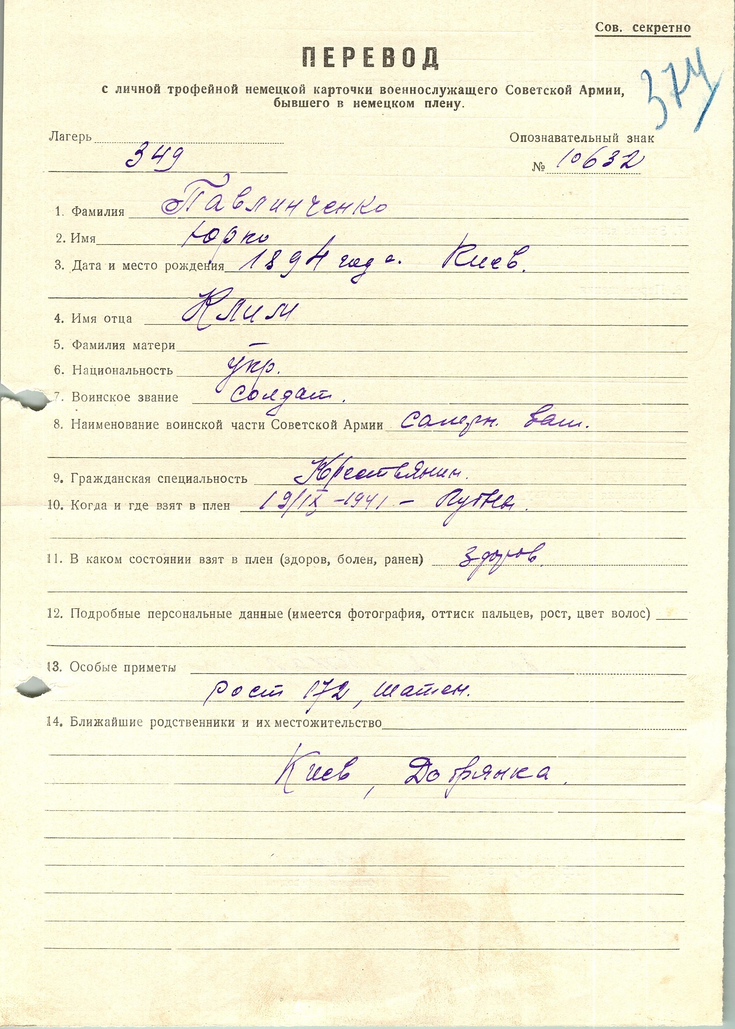 Павличенко Юрко Климович, 1894 г. р., г. Киев. Рядовой саперного батальйона. Попал в плен 19.09.1941 г. в Лубнах, шталаг 349. 20.10.1942 г. бежал из плена.