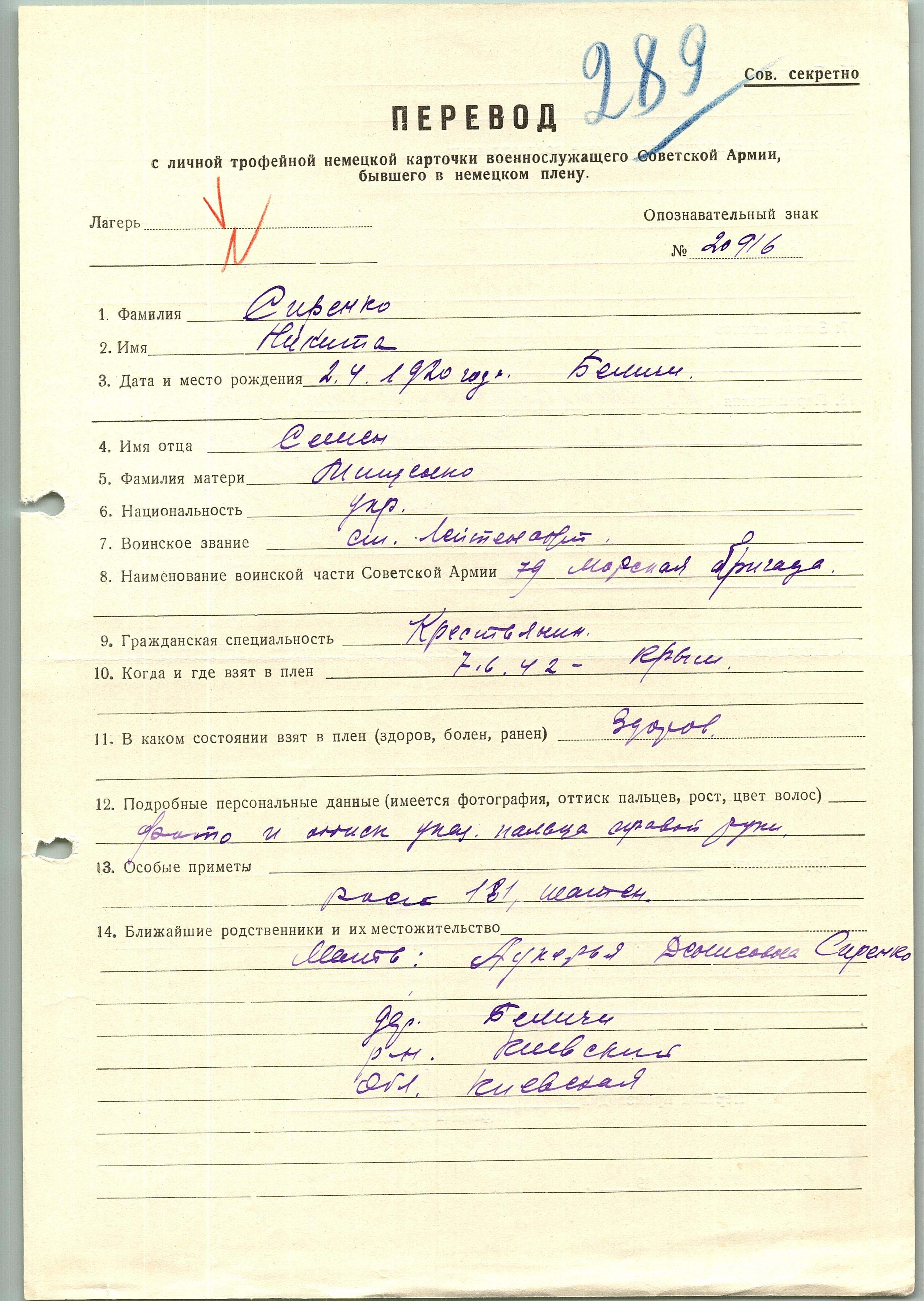 Сиренко Никита Семенович, 02.04.1920 г. р., с. Беличи. Лейтенант, 79 морская бригада. Попал в плен 07.06.1942 г. в Крыму. 25.09.1942 г. был переведен в офицерский лагерь 62, 28.07.1943 г. бежал из плена.