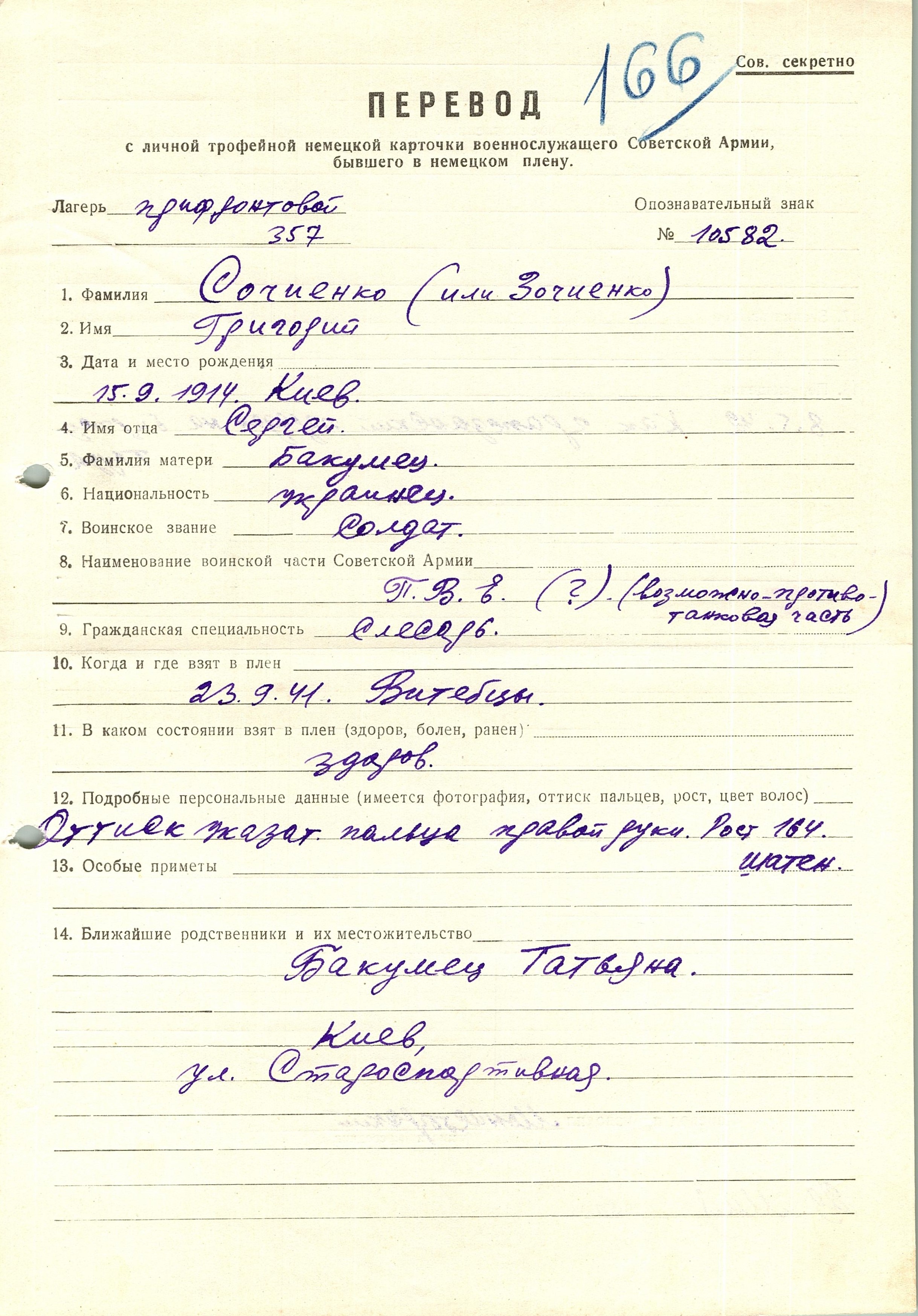 Сочиенко (или Зочиенко) Григорий Сергеевич, 15.09.1914 г. р., г. Киев. Рядовой, П.В.Е. (возможно - противотанковая часть). Попал в плен 23.09.1941 г. в Витебцах, прифронотовый шталаг 357. 08.05.1941 г. как гражданский передан на биржу труда.