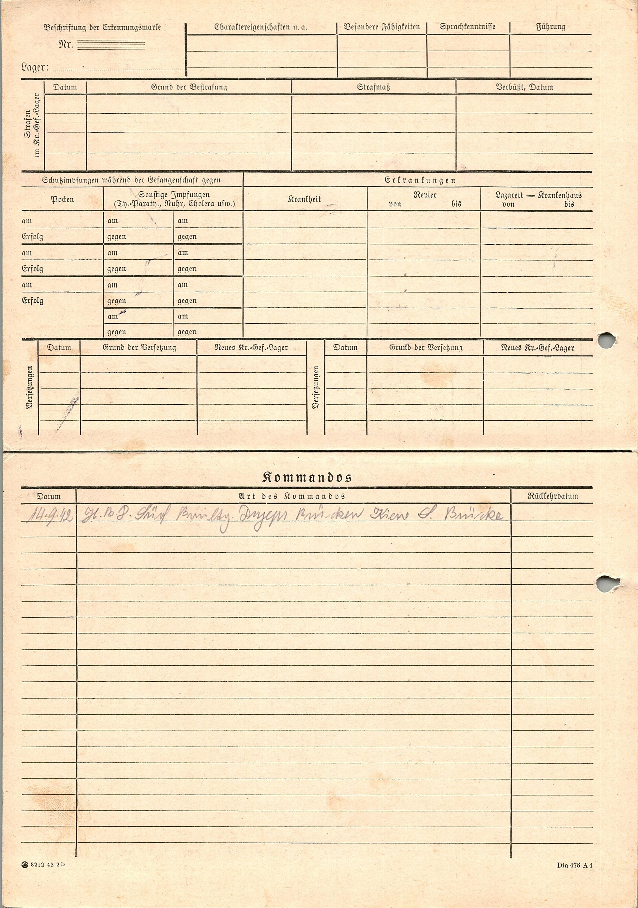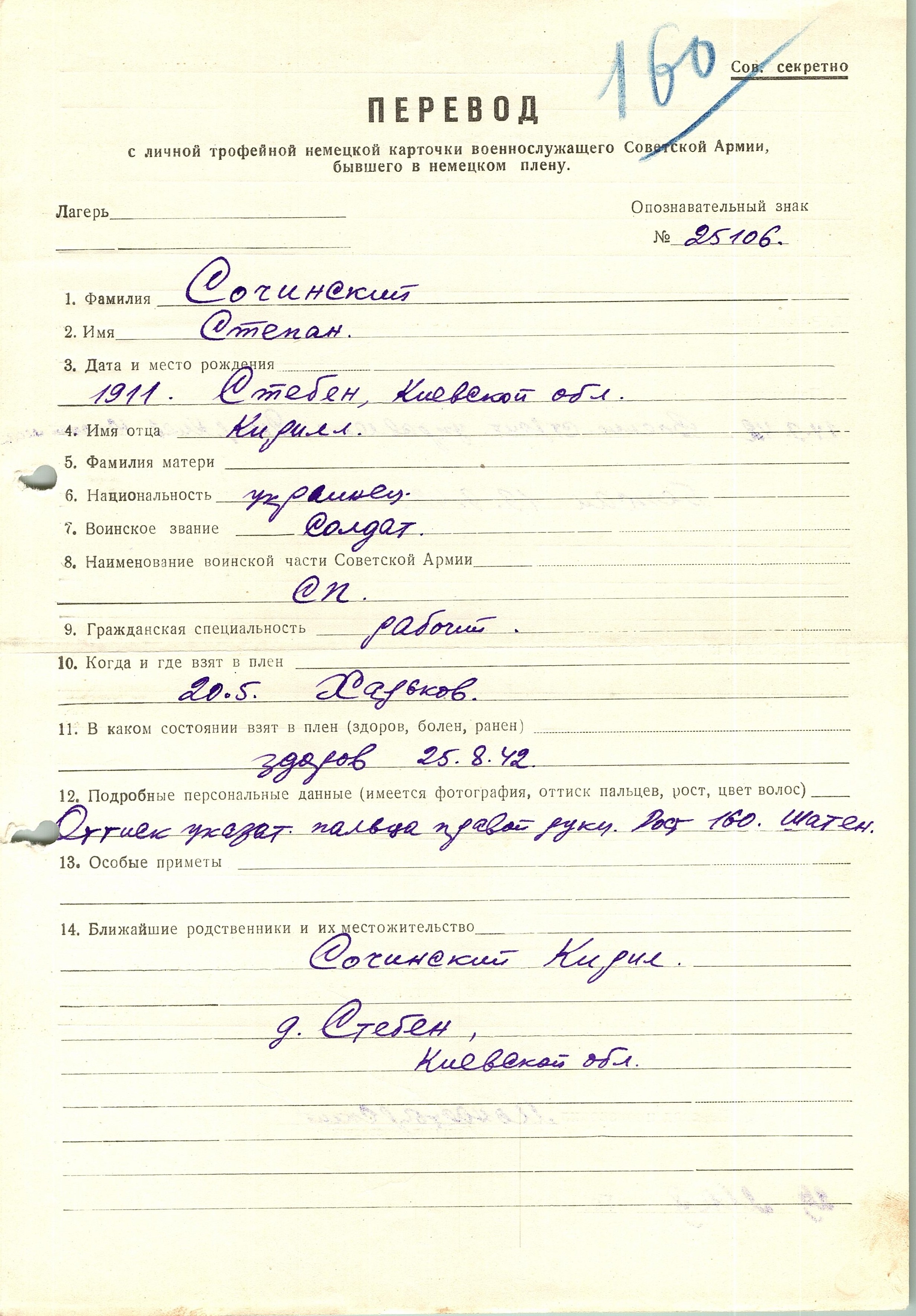 Сочинский Степан Кириллович, 1911 г. р., с. Стебен, Киевская область. Рядовой стрелкового полка. Попал в плен 20-го мая в Харькове. 14.09.1942 г. отправлен в военно-строительное управление, Днепр, Киев. 19.09.1942 г. бежал из плена.