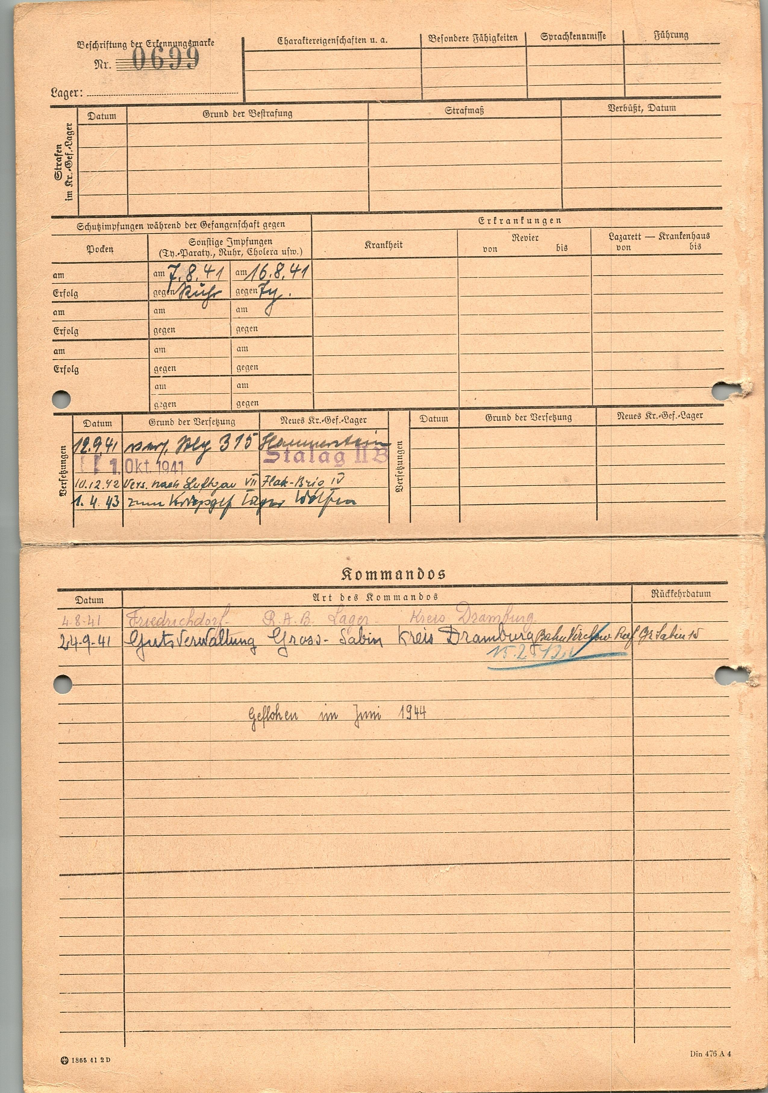 12.09.1941 г. был переведен в лагерь 315 (Хаммерштейн), 01.10.1941 г. - в лагерь II Б, 01.04.1943 г. - в лагерь военнопленных военно-вохдушных сил Вольфен. Бежал из плена в июне 1944 года.
