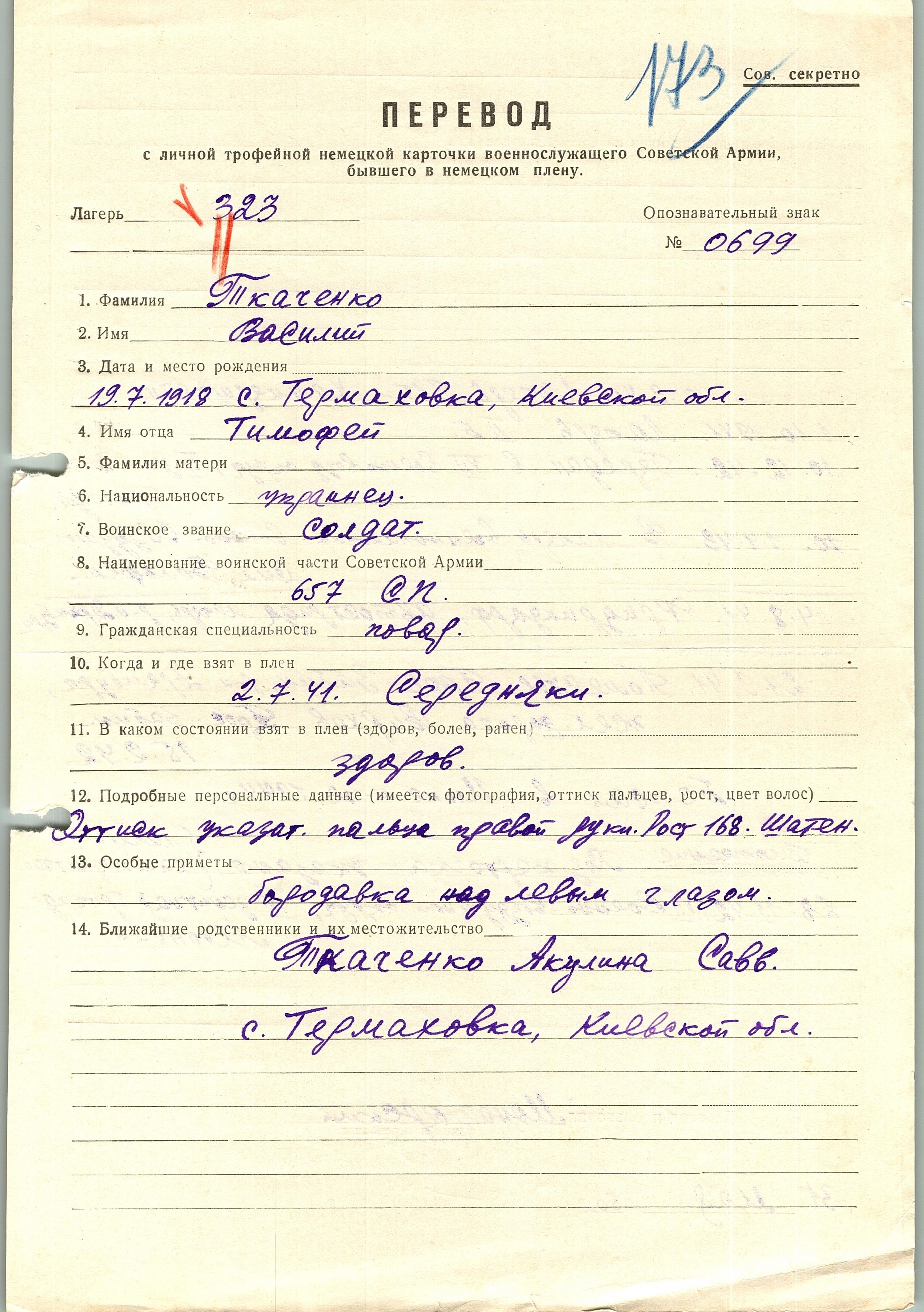 Ткаченко Василий Тимофеевич, 19.07.1918 г. р., с. Термаховка, Киевская область. Старшина, 657 стрелковый полк. Попал в плен 02.07.1941 г. в с. Середняки, шталаг 323.