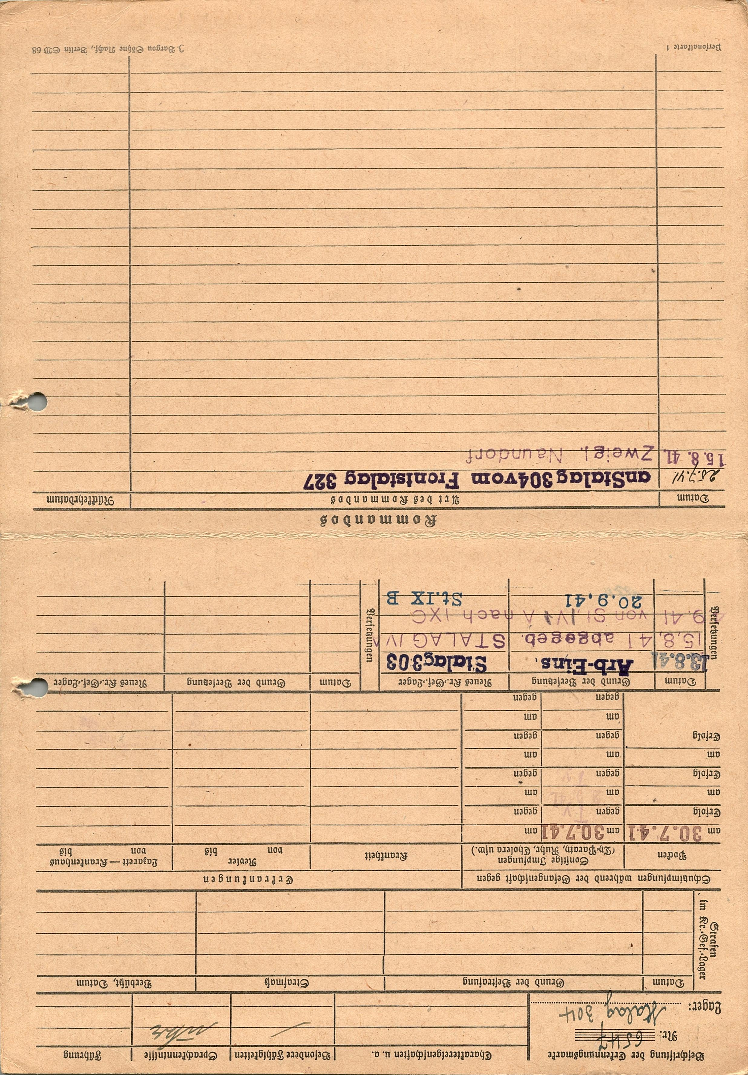 13.08.1941 г. был перемещен в лагерь 303, 15.08.1941 г. - в лагерь IV A, 04.09.1941 г. - в шталаг IX Ц, 20.09.1941 г. - в лагерь IX Б.
