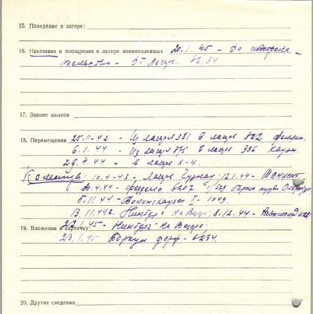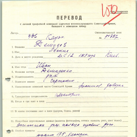 Демидов Леонид Иванович, 20.12.1919 г. р., г. Киев. Сержант фронтовой дивизии. Попал в плен шталаг 336 Кауэн. 25.11.1942 г. был перевден в лагерь 322 Феллин, 06.01.1944 г. - 336 Кауэн, 29.04.1944 г. - в лагерь Х Ц.