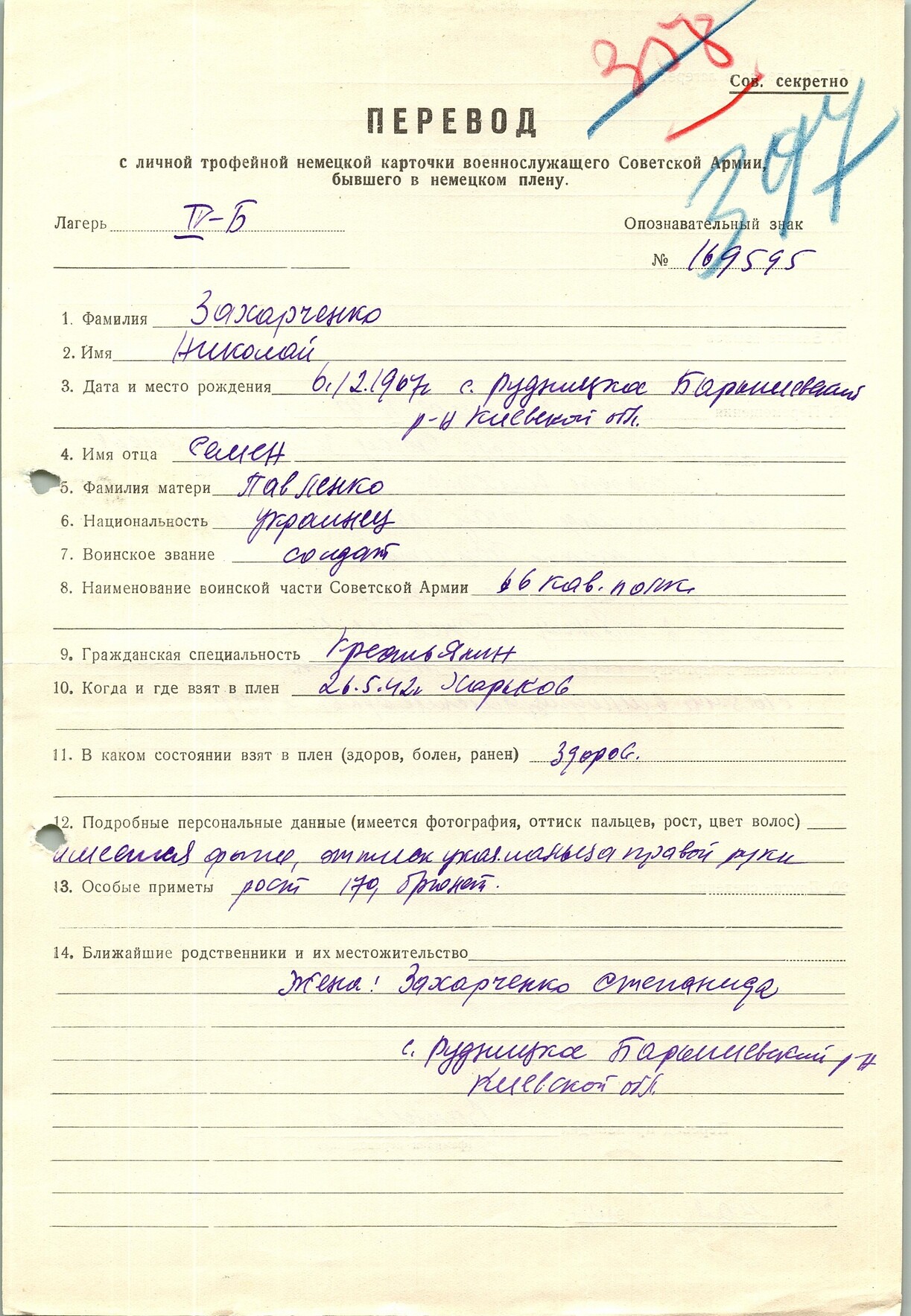 Захарченко Николай Семенович, 06.12.1907 г. р., с. Рудницкое, Барышевский район, Киевская область. Рядовой, 66 кавалерийский полк. Попал в плен 26.05.1942 г. в Харькове, шталаг IV Б. 14.08.1942 г. был переведен в лагерь IV Ф.