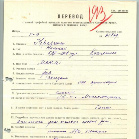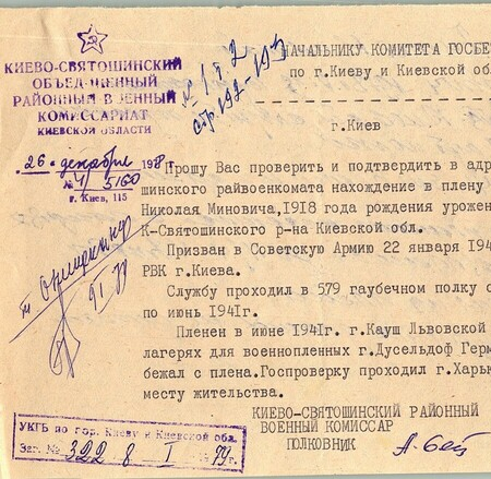 Кравченко Николай Минович, 06.12.1918 г. р., с. Кухильчина. Рядовой, 579 артиллерия. Попал в плен 01.07.1941 г. в Монастыриске шталаг VI Ц.