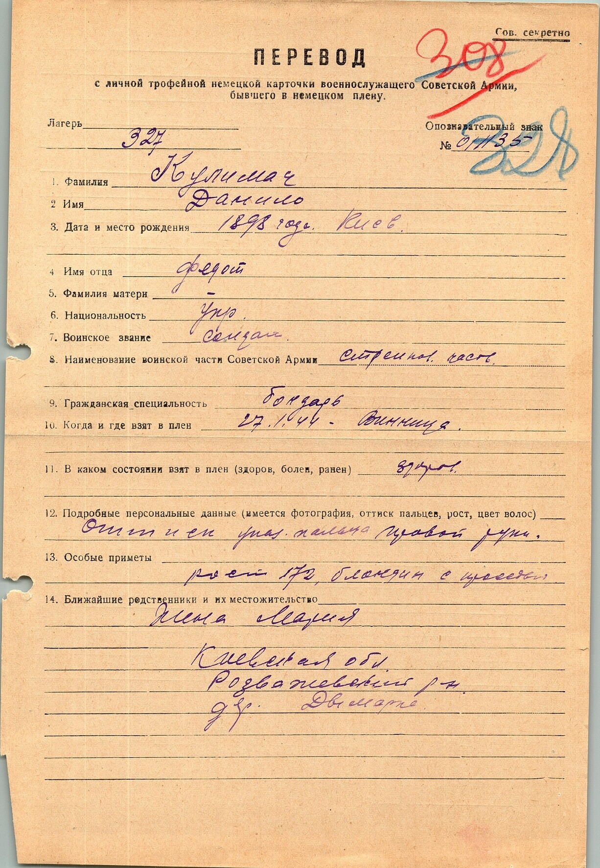 Кулимач Данило Федотович, 1898 г. р., г. Киев. Рядовой стрелкового полка. Попал в плен 27.01.1944 г. в Виннице, шталаг 327.