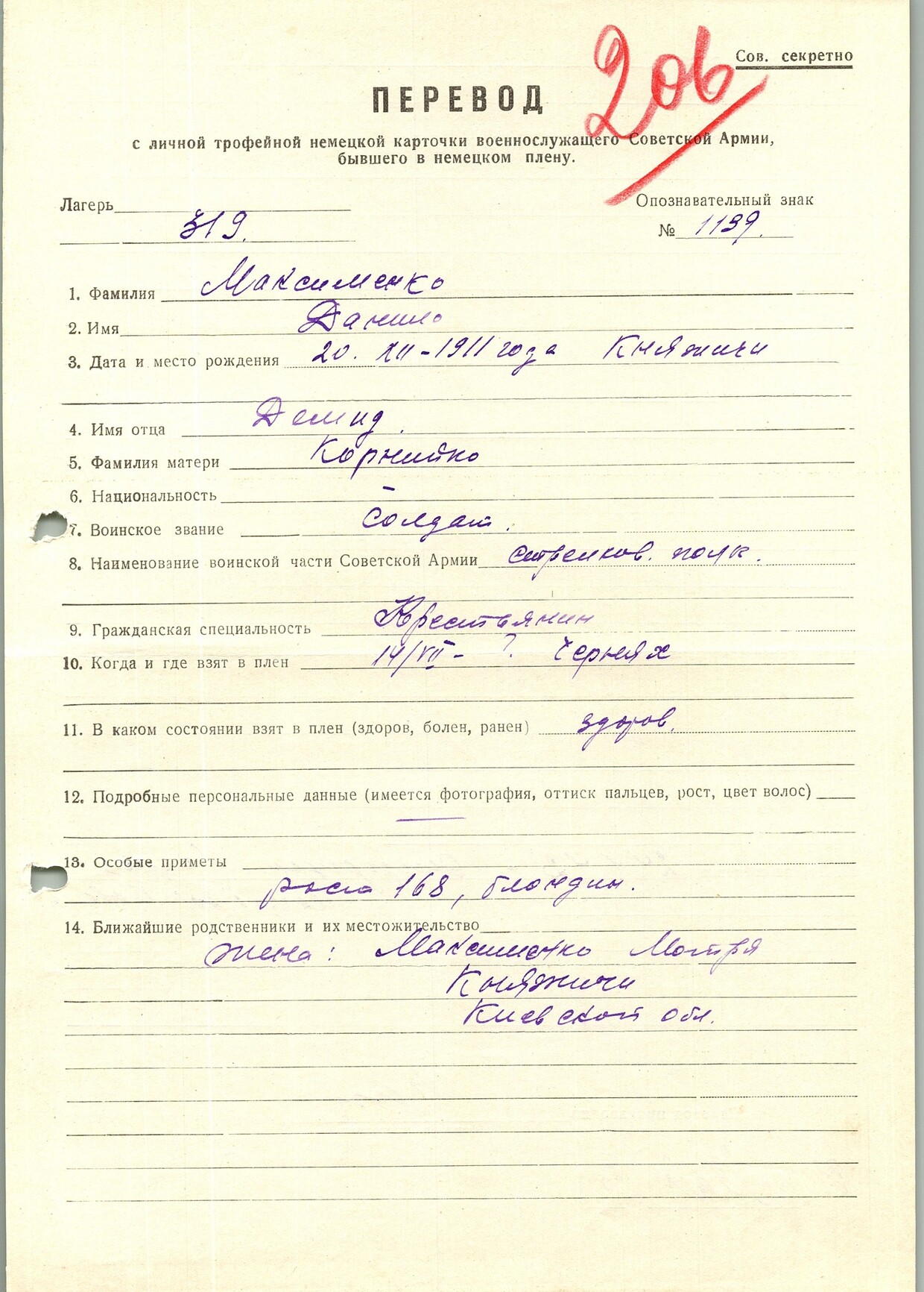 Максименко Данило Демидович, 20.12.1921 г. р., с. Княжичи. Рядовой стрелкового полка. Попал в плен 14 июля в Черняхах, шталаг 319. 24.04.1942 г. отпущен через лагерь 301 (Ковель).