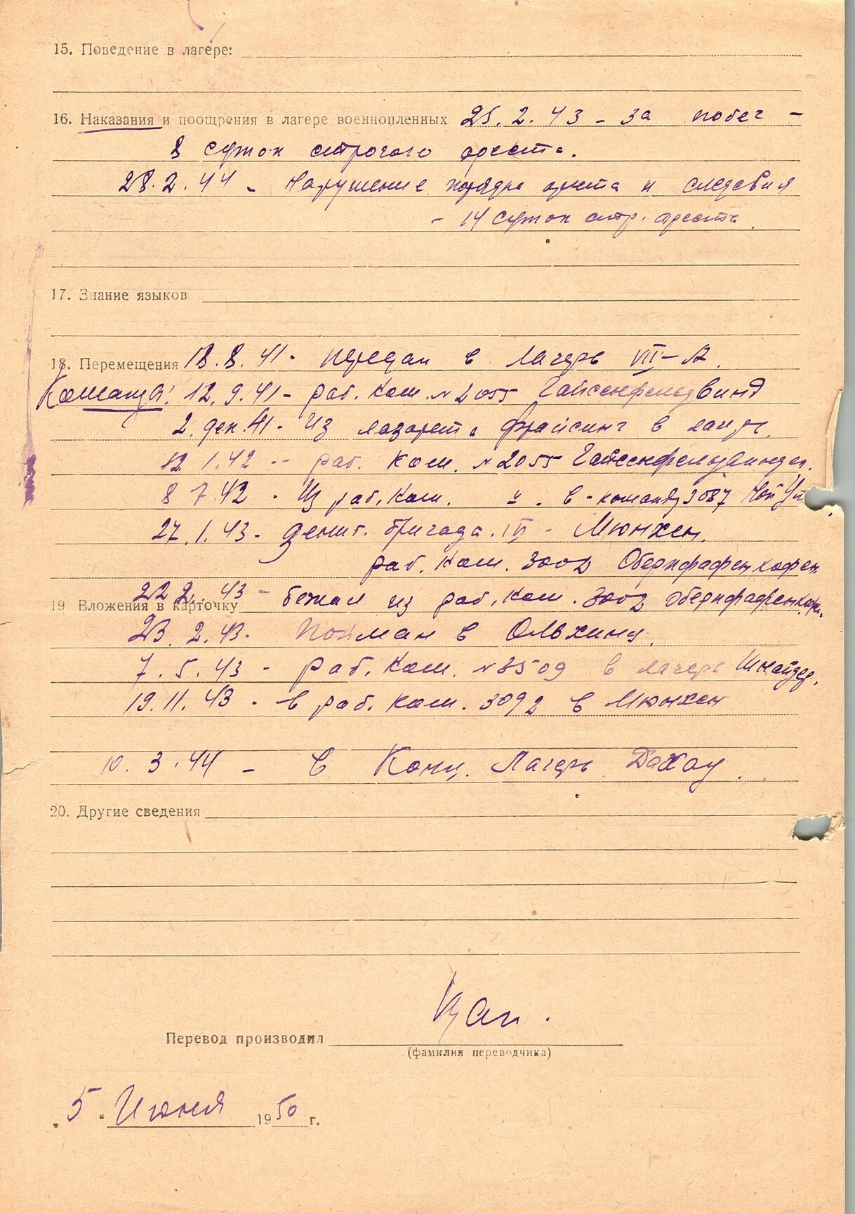18.08.1941 г. был переведен в лагерь VII A, 10.03.1944 г. - в концлагерь Дахау.