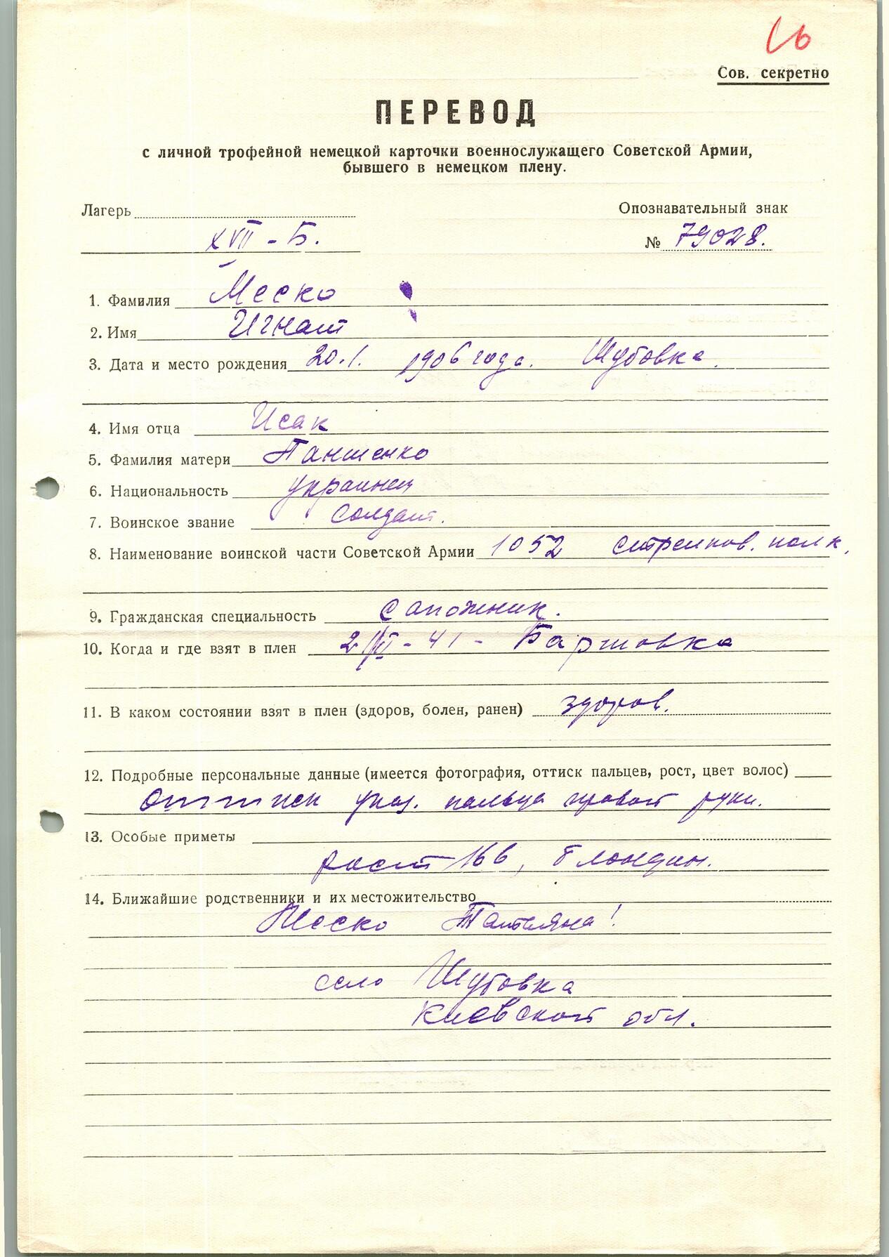 Меско Игнат Исаакович, 20.01.1906 г. р., д. Шубовка. Рядовой, 1052 стрелковый полк. Попал в плен 21.02.1941 г. в Баршовке, шталаг XVII Б. 28.07.1942 г. бежал из плена.
