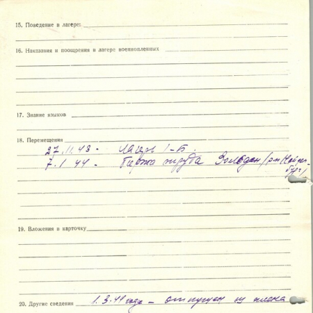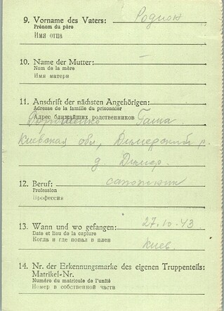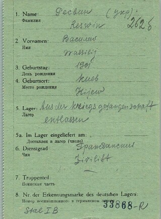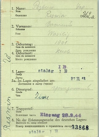 Резвин Василий Радионович, 1901 г. р., г. Киев. Гражданский. Попал в плен 27.10.1943 г. в Киеве, шталаг I Б. 27.11.1943 г. был переведен в лагерь І Б, 07.01.1944 г. отправлен на биржу труда Зольбен, район Нейденбург.