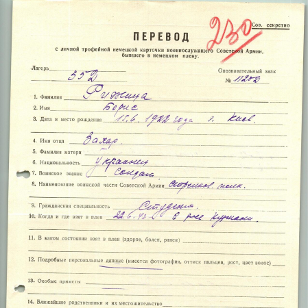 Рижина Борис Захарович, 15.06.1922 г. р., г. Киев. Рядовой стрелкового полка. Попал в плен 22.06.1943 г. в р-не Куршани, шталаг 352. 05.02.1943 г. был переведен в лагерь 352 в Минск.