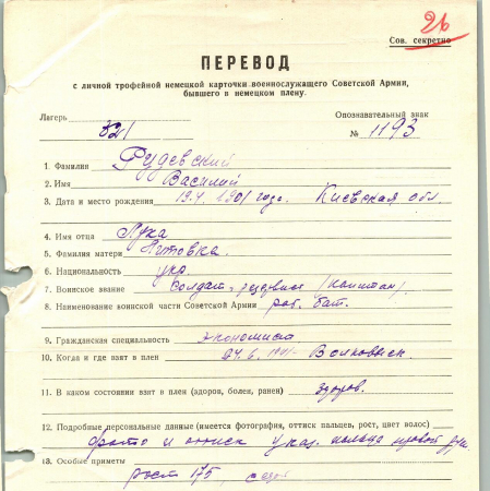 Рудевский Василий Лукич, 19.04.1901 г. р., Киевская область. Попал в плен 24.06.1941 г. в Волковыске, шталаг 321. 02.10.1941 г. направлен в Заксенхаузен, Берлин.