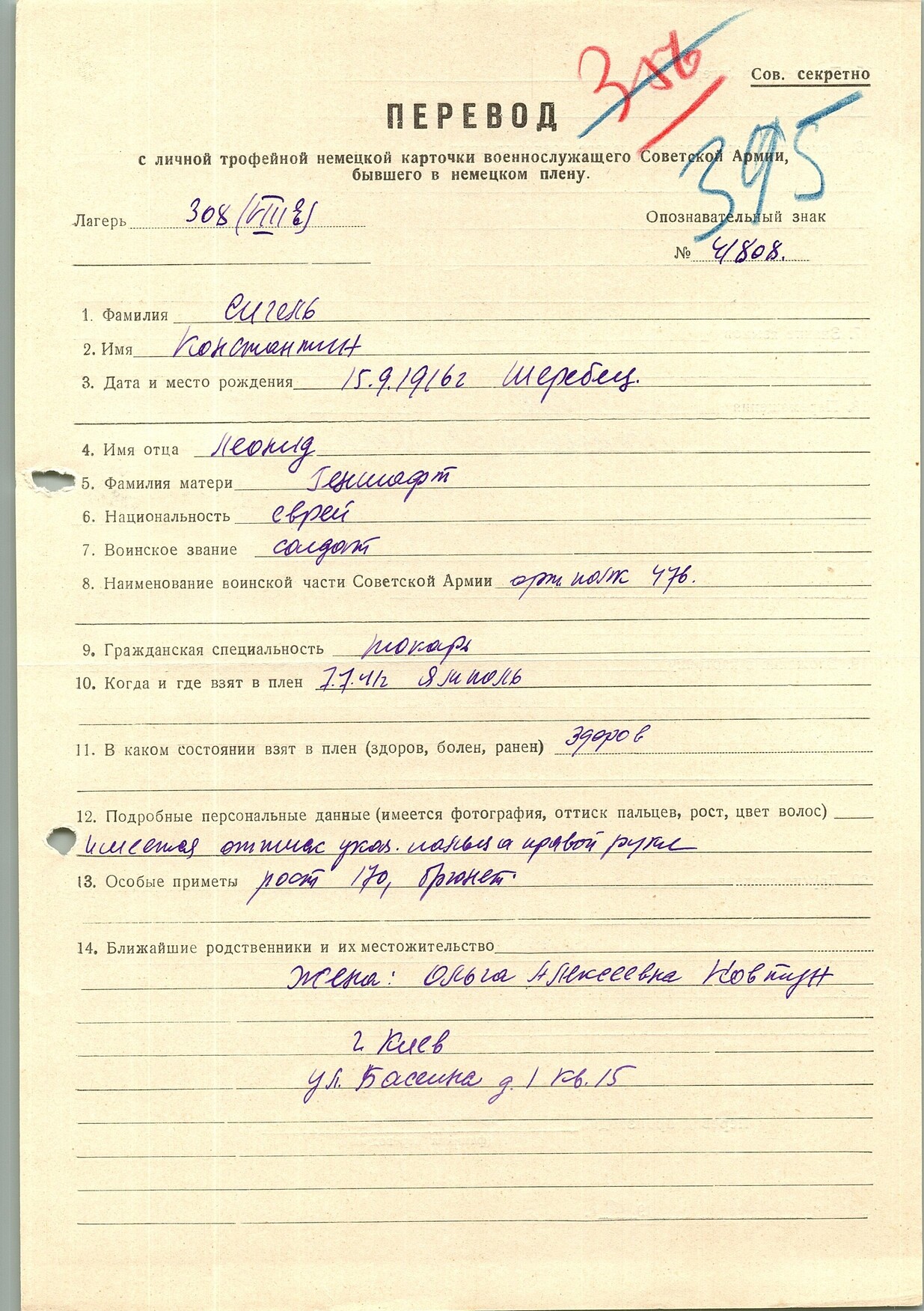 Сигель Константин Леонидович, 15.09.1916 г. р., с. Шеребец. Рядовой, 476 артиллерийского полка. Попал в плен 07.07.1941 г. в Ямполе, шталаг (308 VIII Е). 16.04.1942 г. переведен из "С" блока.