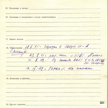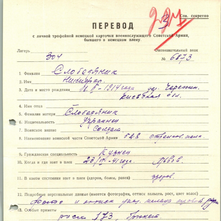 Слободяник Никифор, 18.02.1914 г. р., д. Черепин, Киевская область. Рядовой, 528 стрелковый полк. Попал в плен 23.06.1941 г. во Львове, шталаг 304. 18.08.1941 г. был переведен в лагерь VII А, 10.09.1942 г. бежал из плена.