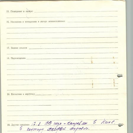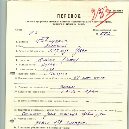 Тыщенко Леонтий Симонович (Семенович), 1907 г. р., Умань. Рядовой, 61 артиллерийский полк. Попал в плен 03.07.1942 г. в Крыму, шталаг VI Д. 17.02.1943 г. был направлен в Киев в контору лесной торговли.