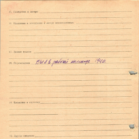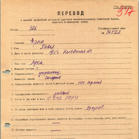 Ерко Павел Лукич, 1915 г. р., Киевская область. Украинец. Рядовой, 144 армия. Попал в плен 15.05.1942 г. в г. Керчь. Был в рабочей команде 1940.