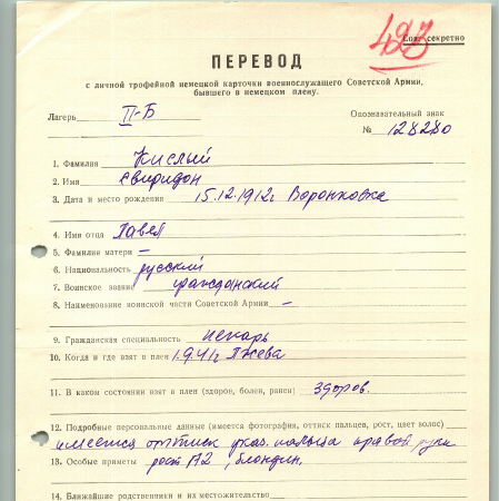 Кислый Свиридон Павлович, 15.12.1912 г. р., Воронковка, Киевская область. Русский. Гражданский. Попал в плен 01.09.1941 г. в Пжеве.