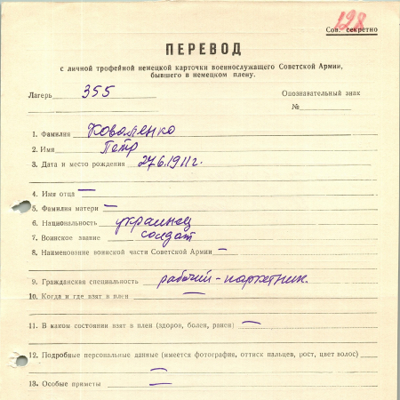 Коваленко Петр, 27.06.1911 г. р. Украинец. Рядовой. Был в рабочей команде Мазовее. 22.12.1942 г. бежал из плена.