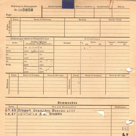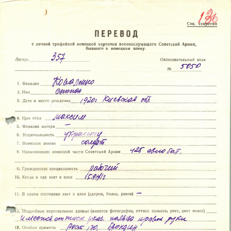 Коваленко Степан Максимович, 1920 г. р., Киевская область. Украинце. Рядовой, 425 автобатальйон. Попал в плен 15.09.1941 г. С 09.05.1942 г. находился в команде 1237 Бремен Грамбкер Геерштр, с 05.06.1942 г. - на гражданской работе, биржа труда, г. Бремен.