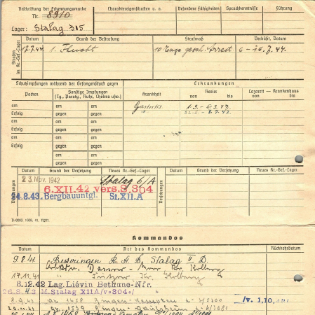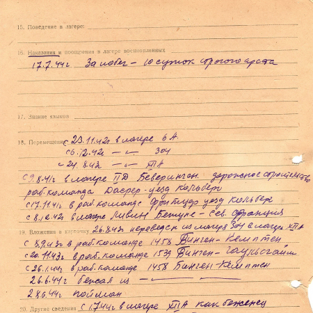 17.07.1944 г. заа побег получил 10 суток строго ареста. С 23.11.1942 г. находился в лагере 6А, с 06.12.1942 г. - в лагере 304, 24.08.1943 г. - в лагере XIIА. С 09.08.1941 г. - в лагере IIД Беверинген, дорожное строительство рабочая команда Дасрер – уезд Кольберг. С 17.11.1941 г. находился в рабочей команде Фритцер, уезд Кольберг, с 08.12.01942 г. - в лагере Льевен Бетюн – Сев. Франция. 26.08.1943 г. был переведен из лагеря 304 в лагерь XIIA, 08.09.1943 г. - в рабочей команде 1458 Бинген-Кемптен. С 20.11.1943 г. - в рабочей команде 1539 Бинген-Кемптен, 26.01.1944 г. - находился в рабочей команде 1458 Бинген-Кемптен, 26.04.1944 г. бежал из рабочей команды 1539 Бинген-Кемптен, 28.06.1944 г. - пойман. С 01.07.1944 г. находился в лагере XIIA как беженец, 17.07.1944 свободен для работы, с 28.07.1944 г. - в рабочей команде 1367 Майнц.