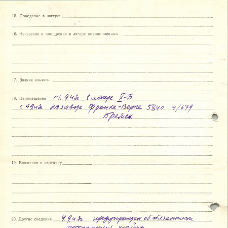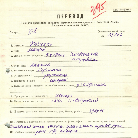 Козинко Матвей Акахиевич, 09.08.1900 г. р., с. Кумейки, Киевская область. Украинец. Рядовой, 936 стрелковый полк. Попал в плен 01.08.1941 Н-Северский. С 01.09.1942 г. находился в лагере Х-Б, с 02.09.1942 г. - на заводе Франке-Берке 5840 4/679 г. Бремен.