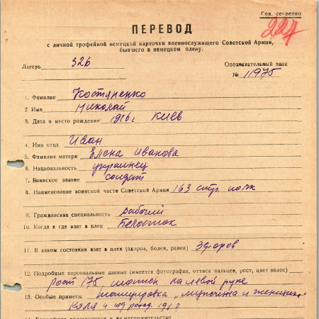 Костяненко Николай Иванович, 1916 г. р., г. Киев. Украинец. Рядовой, 163 стрелковый полк. Попал в плен в г. Белосток.