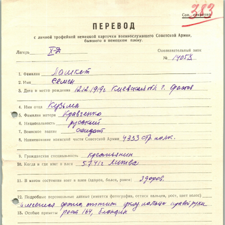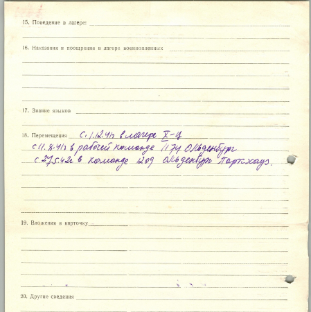 Лашкет Семен Кузьмич, 12.12.1919 г. р., г. Фастов, Киевской области. Русский. Рядовой, 4333 стрелковый полк. Попал в плен 05.07.1941 г. в Литве. С 01.12.1941 г. находился в лагере Х-У, с 11.08.1941 г. - в рабочей команде 1174 Ольденбург, с 27.05.1942 г. - в команде 1209 Ольденбург Паркхауз.