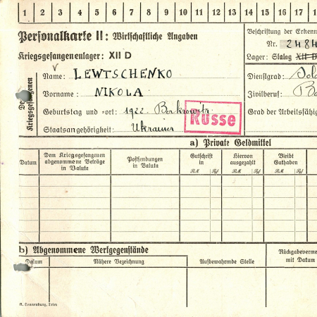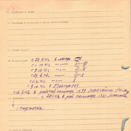 С 27.09.1941 г. находился в лагере XIIA, с10.1941 г. - в лагере XII-Ф, 09.10.1941 г.- лагерь XII-Б. С 27.02.1942 г. находился в лагере XII-А, с 11.08.1941 г. - в лагере 8, 09.10.1941 г. был направлен в Пронсфельд. С 16.07.1942 г. находился в рабочей команде 1966 Мангайм-Рейнау, с 25.01.1943 г. - в рабочей команде 1381 Мангайм.