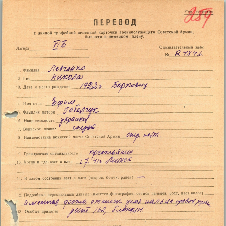 Левченко Николай Ефимович, 1922 г. р., г. Берковиц. Украинец. Рядовой стрелкового полка. Попал в плен 01.07.1941 г. в г. Минск.