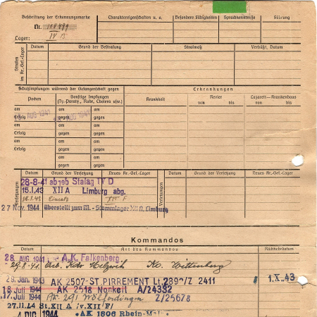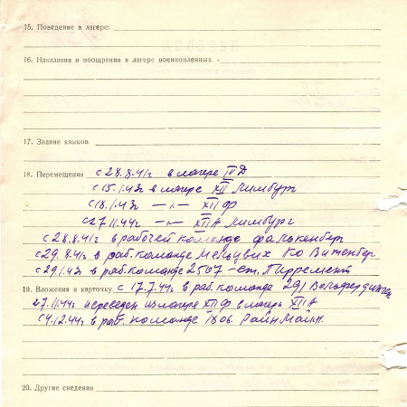 Вложения в картоку. С 17.07.1944 г. был в рабочей команде 291 Вольфердинген, 27.11.1944 г. - переведен из лагеря XIIФ в лагерь XIIА, 04.12.1944 г. - в рабочей команде 1806 Райнмайн.