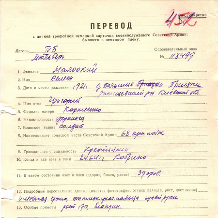 Малоокий Семен Григорьевич, 1921 г. р., д. Большие Прицки, Ржищевский район, Киевской области. Украинец. Рядовой, 68 артиллерийский полк. Попал в плен 24.06.1941 г. в Кобрино. С 28.08.1941 г. находился в лагере IVД. С 15.01.1943 г. - в лагере XII Лимбург, с 18.01.1943 г. - в лагере XIIФ, с 27.11.1944 г. - в лагере XIIА Лимбург. С 28.08.1941 г. находился в рабочей команде фалькенберг, 29.08.1941 г. - в рабочей команде Мельцвих Ко Витенберг, 29.01.1943 г. - в рабочей команде 2507 – ст. Пиремент.