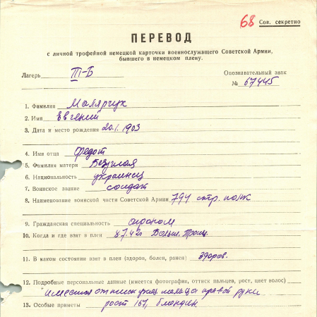 Малярчук Евгений Федотович, 20.01.1903 г. р. Украинец. Рядовой, 794 стрелковый полк. Попал в плен 08.07.1942 г. в с. Больш. Троиц. 17.08.1942 г. был переведен из Кировограда лагерь 305 в лагерь III-Б, 12.09.1942 г. - передан в концлагерь Заксенхаузен.