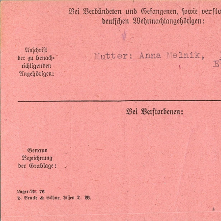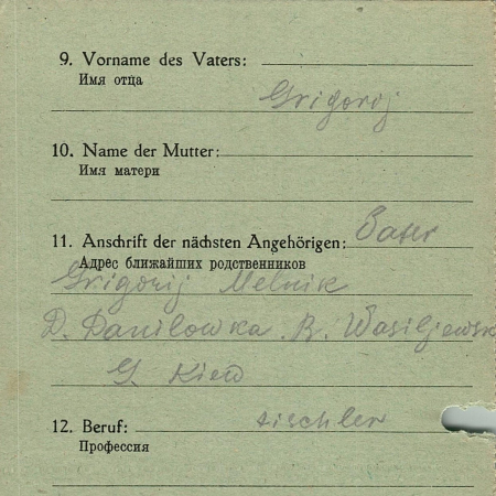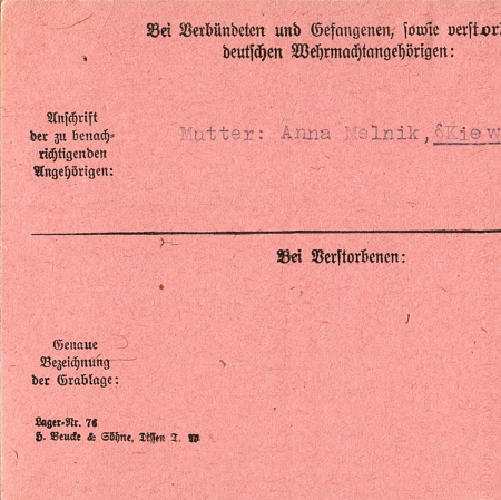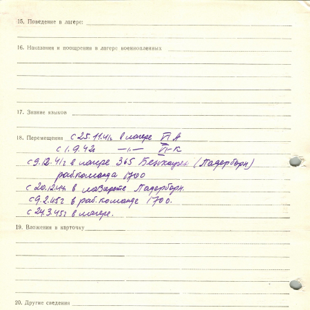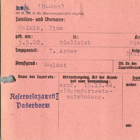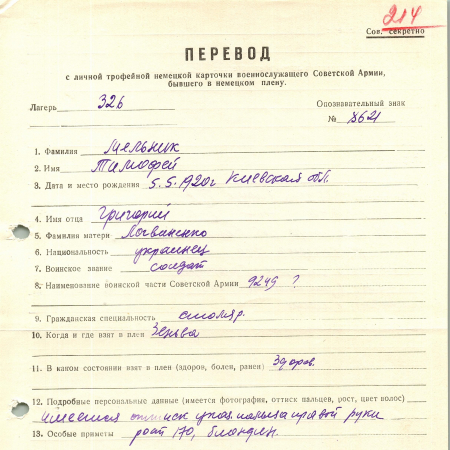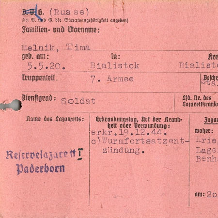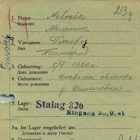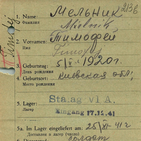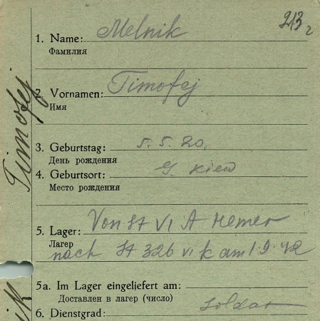 Мельник Тимофей Григорьевич, 05.05.1920 г. р. Киевская область. Украинец. Рядовой, 9249. Попал в плен в Зельве. С 25.11.1941 г. находился в лагере VI-A, с 01.09.1942 г. - в лагере VI-К, с 09.12.1941 г. - в лагере Бенхаузен (Падерборн) рабочая команда 1700. С 20.12.1944 г. был в лазарете Падерборн, 09.02.1945 г. - в рабочей команде 1700, 24.03.1945 г. - в лагере.