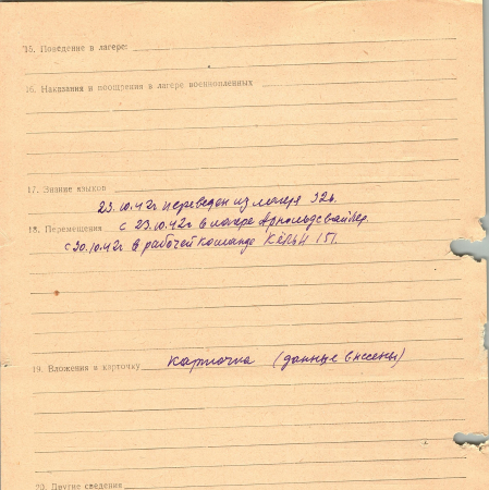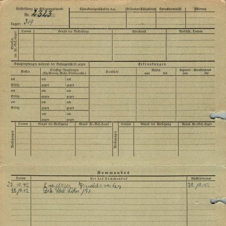 Нижник Иван Миронович, 10.03.1911 г. р., с. Ярошовка, Фастовский район, Киевская область. Украинец. Рядовой, 396 стрелковый полк. Попал в плен 07.07.1941 г. у Житомира. 23.10.1942 г. был переведен из лагеря 326, с 23.10.1942 г. находился в легере Арнольдсвайлер, 30.10.1942 г. - в рабочей команде Кёльн 151.