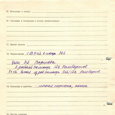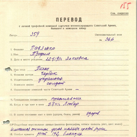 Павленко Трофим Тихонович, 22.07.1911 г. р., с. Янковка, Узинский район, Киевская область. Украинец. Рядовой. Попал в плен 09.07.1941 г. в п. Любар. С 23.09.1942 г. находился в лагере 366, далее - Зели 312 Варшава, в рабочей команде 128 Рембертув. 09.06.1943 г. бежал из рабочей команды 366/128 Рембертув.